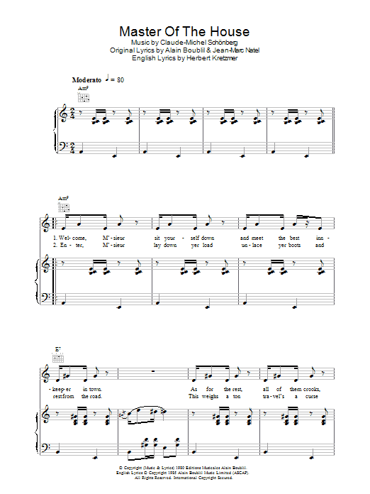 Download or print Alain Boublil Master Of The House sheet music, chords and digital score arranged for Lead Sheet / Fake Book. This Musical/Show score includes 2 page(s).