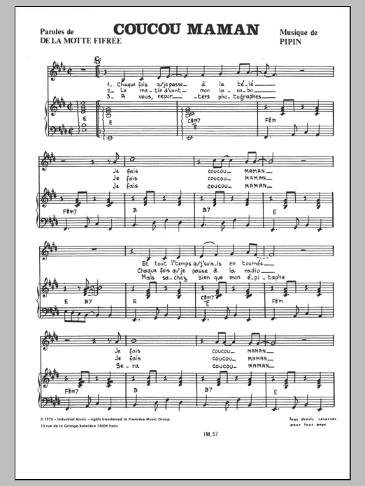 Download or print Alain Ranval Coucou Maman sheet music, chords and digital score arranged for Piano & Vocal. This French score includes 3 page(s).