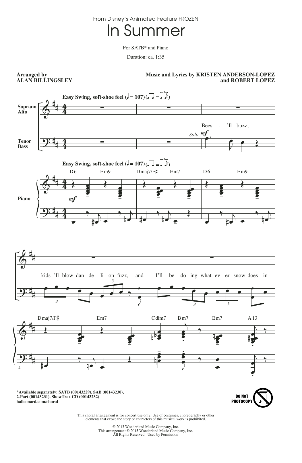 Download or print Josh Gad In Summer (from Frozen) (arr. Alan Billingsley) sheet music, chords and digital score arranged for SATB Choir. This Children score includes 7 page(s).