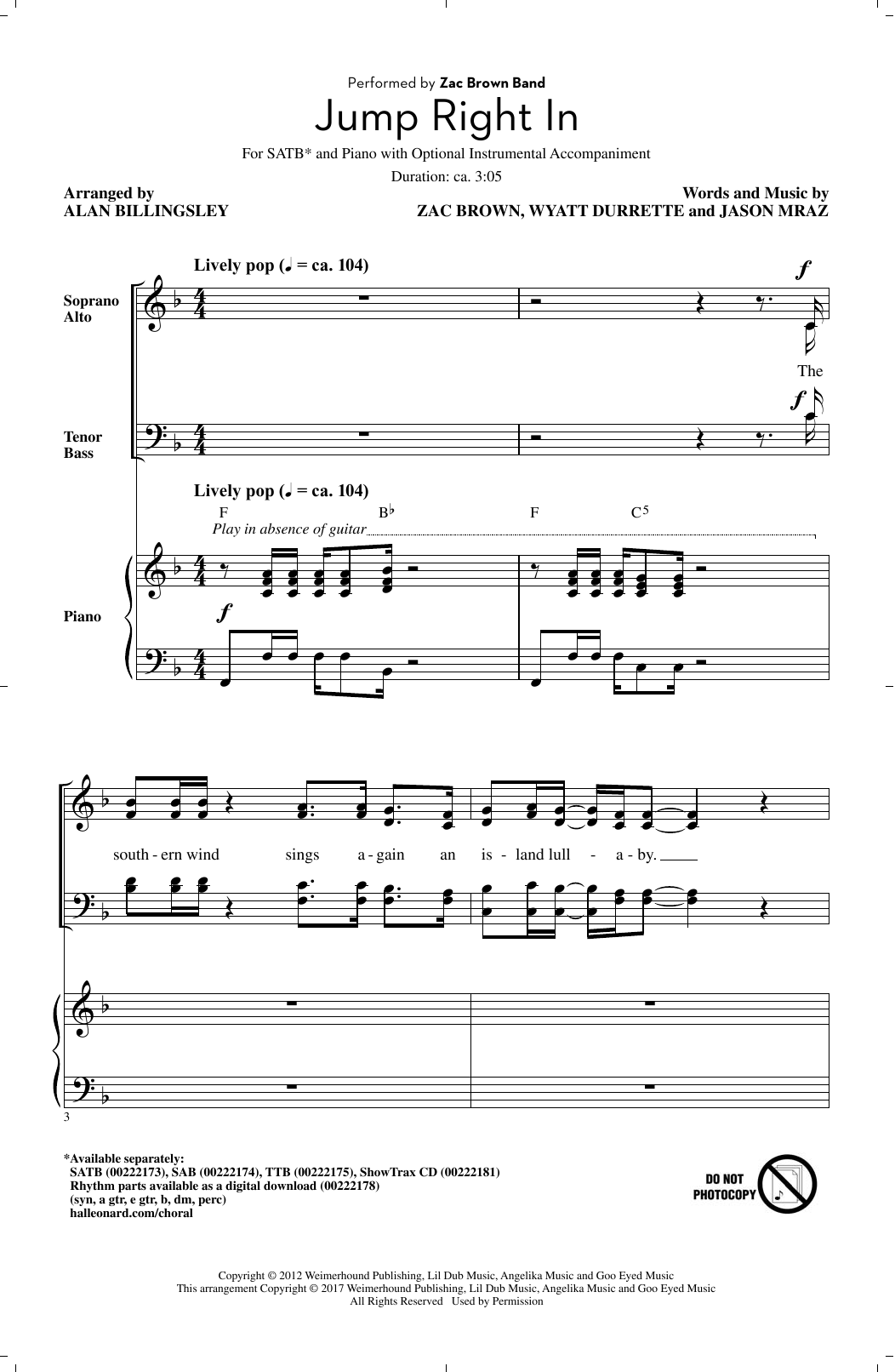 Download or print Alan Billingsley Jump Right In sheet music, chords and digital score arranged for SAB Choir. This Pop score includes 13 page(s).