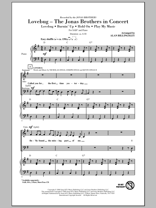 Download or print Alan Billingsley Lovebug - The Jonas Brothers In Concert (Medley) sheet music, chords and digital score arranged for SSA Choir. This Disney score includes 23 page(s).
