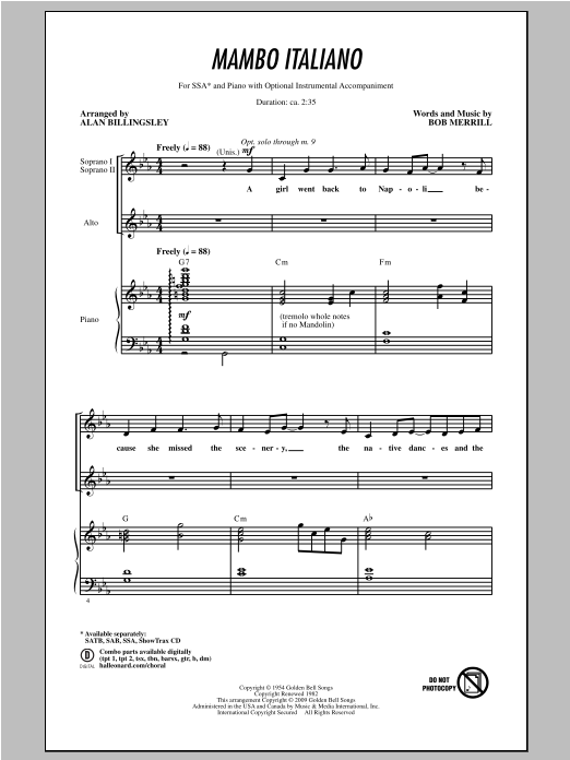 Download or print Bob Merrill Mambo Italiano (arr. Alan Billingsley) sheet music, chords and digital score arranged for SAB Choir. This Standards score includes 11 page(s).