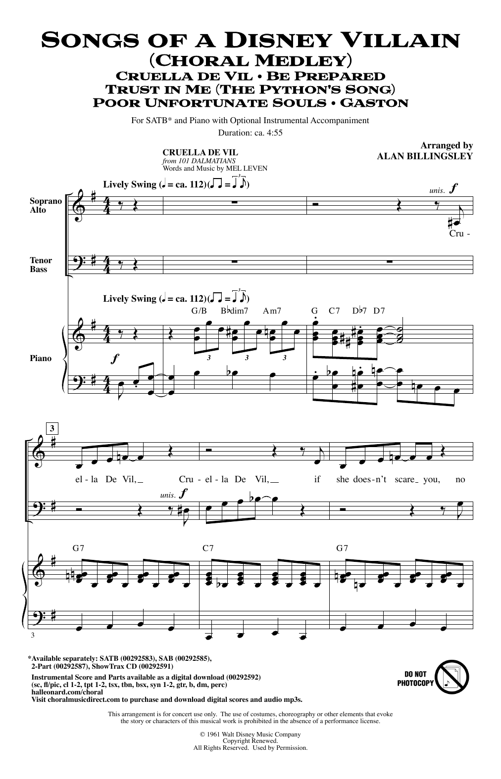 Download or print Alan Billingsley Songs Of A Disney Villain (Choral Medley) sheet music, chords and digital score arranged for SAB Choir. This Disney score includes 19 page(s).