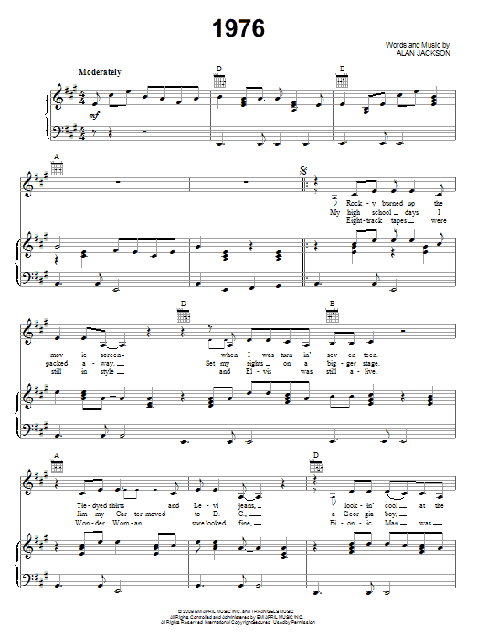Download or print Alan Jackson 1976 sheet music, chords and digital score arranged for Piano, Vocal & Guitar Chords (Right-Hand Melody). This Country score includes 6 page(s).