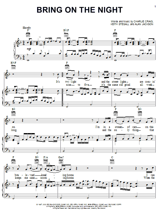 Download or print Alan Jackson Bring On The Night sheet music, chords and digital score arranged for Piano, Vocal & Guitar Chords (Right-Hand Melody). This Pop score includes 4 page(s).