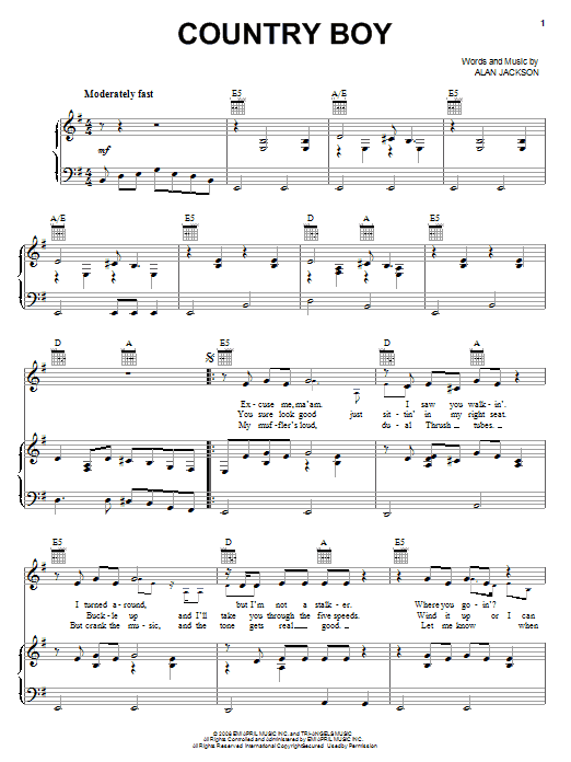 Download or print Alan Jackson Country Boy sheet music, chords and digital score arranged for Piano, Vocal & Guitar Chords (Right-Hand Melody). This Country score includes 8 page(s).