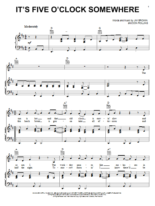 Download or print Alan Jackson It's Five O'Clock Somewhere sheet music, chords and digital score arranged for Piano, Vocal & Guitar Chords (Right-Hand Melody). This Country score includes 6 page(s).