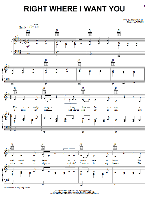 Download or print Alan Jackson Right Where I Want You sheet music, chords and digital score arranged for Piano, Vocal & Guitar Chords (Right-Hand Melody). This Country score includes 4 page(s).
