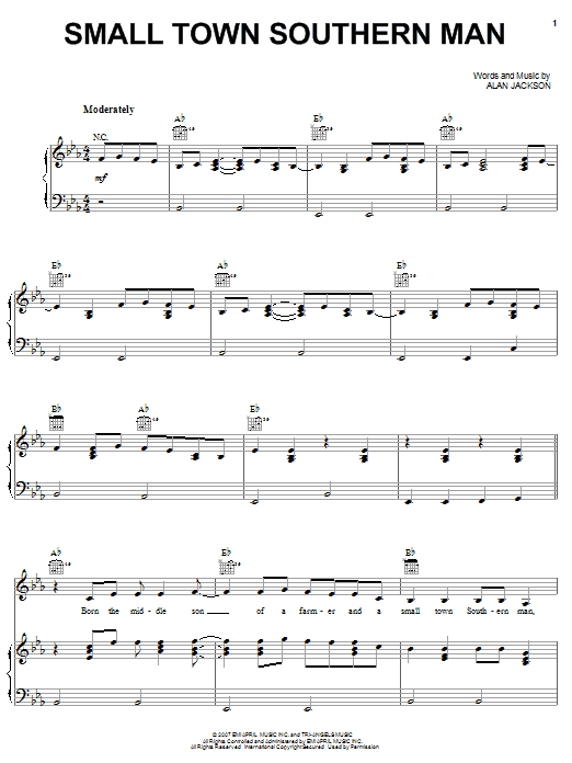 Download or print Alan Jackson Small Town Southern Man sheet music, chords and digital score arranged for Piano, Vocal & Guitar Chords (Right-Hand Melody). This Country score includes 7 page(s).