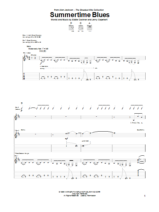 Download or print Alan Jackson Summertime Blues sheet music, chords and digital score arranged for Guitar Tab. This Country score includes 14 page(s).