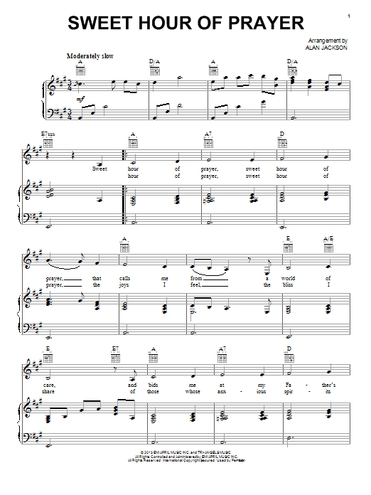 Download or print Alan Jackson Sweet Hour Of Prayer sheet music, chords and digital score arranged for Piano, Vocal & Guitar Chords (Right-Hand Melody). This Gospel score includes 3 page(s).