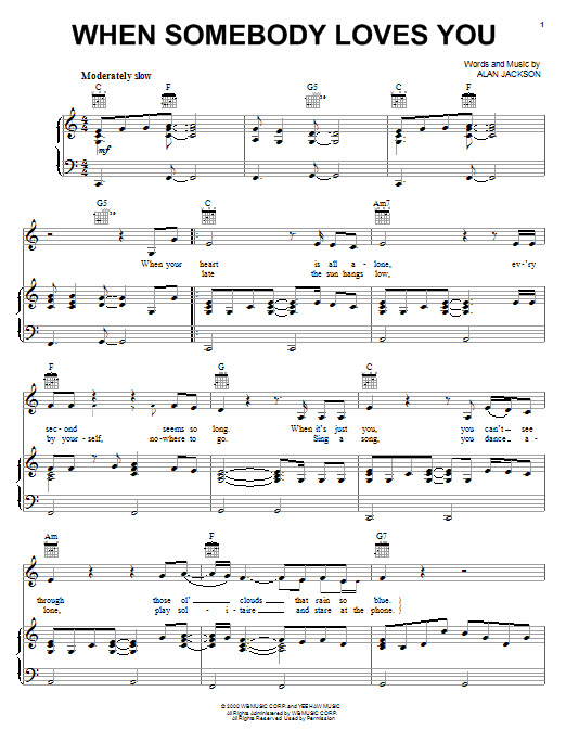 Download or print Alan Jackson When Somebody Loves You sheet music, chords and digital score arranged for Piano, Vocal & Guitar Chords (Right-Hand Melody). This Country score includes 4 page(s).