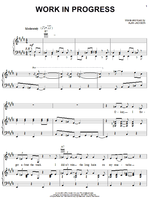 Download or print Alan Jackson Work In Progress sheet music, chords and digital score arranged for Piano, Vocal & Guitar Chords (Right-Hand Melody). This Pop score includes 10 page(s).