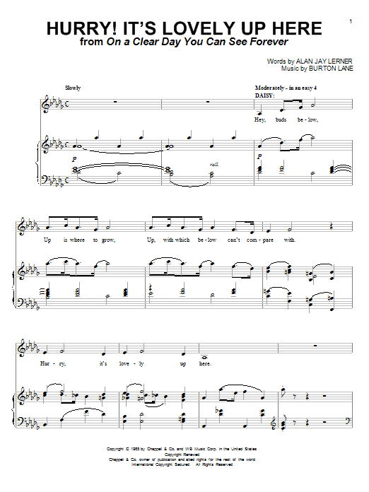 Download or print Alan Jay Lerner Hurry! It's Lovely Up Here! sheet music, chords and digital score arranged for Piano & Vocal. This Musical/Show score includes 6 page(s).
