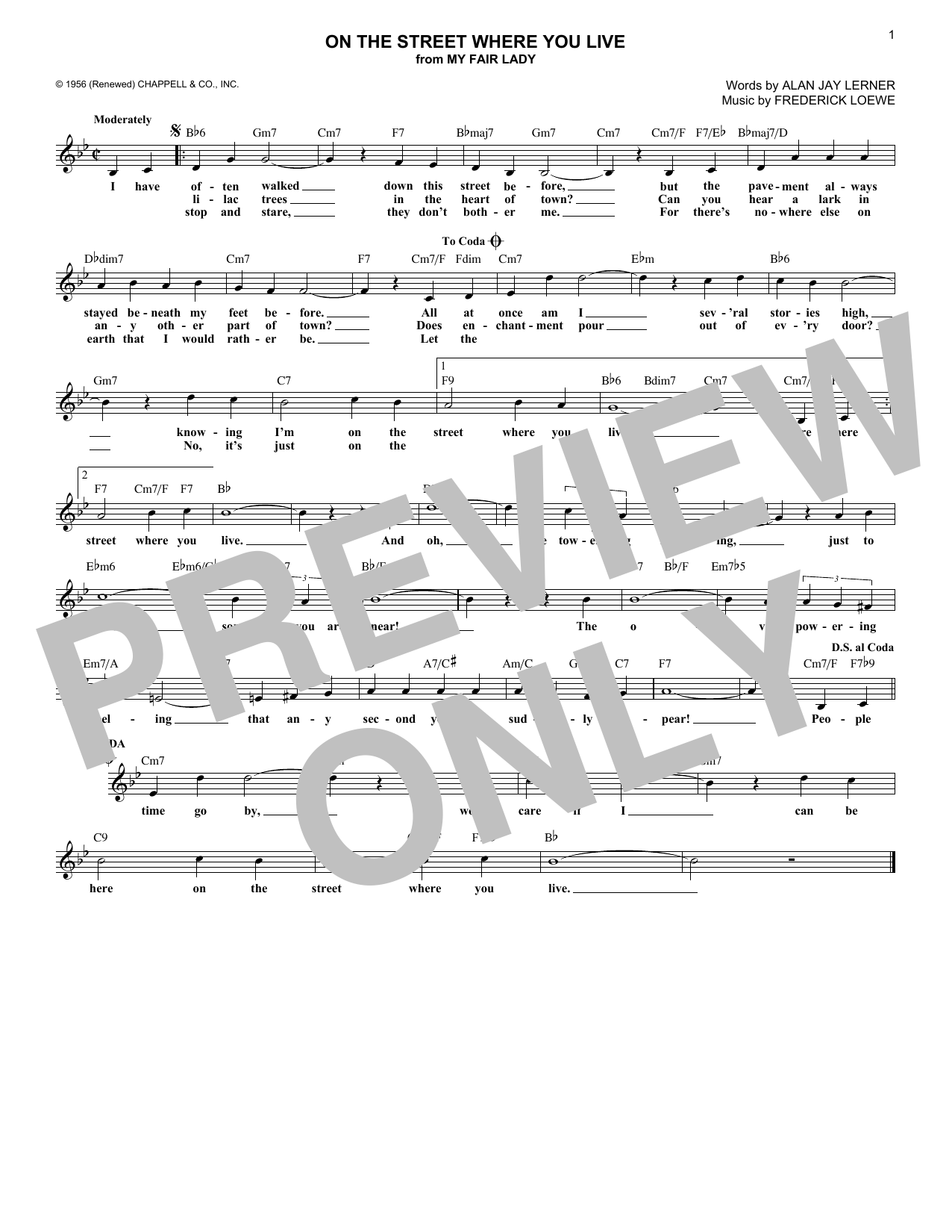 Download or print Alan Jay Lerner On The Street Where You Live sheet music, chords and digital score arranged for Solo Guitar. This Jazz score includes 10 page(s).
