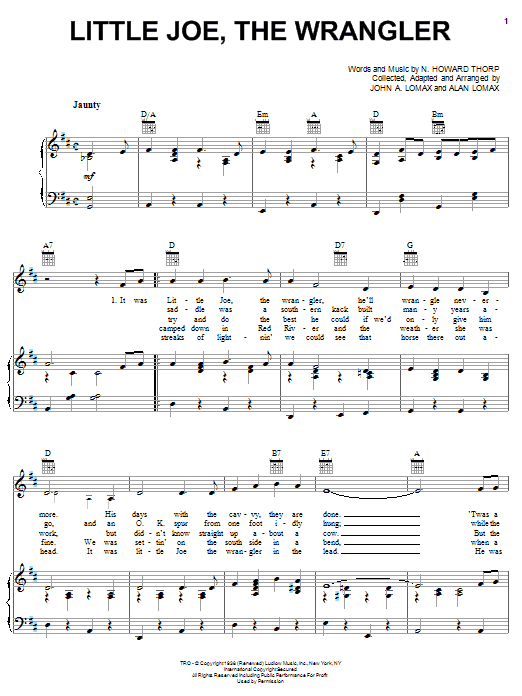 Download or print Alan Lomax Little Joe, The Wrangler sheet music, chords and digital score arranged for Piano, Vocal & Guitar Chords (Right-Hand Melody). This Country score includes 3 page(s).