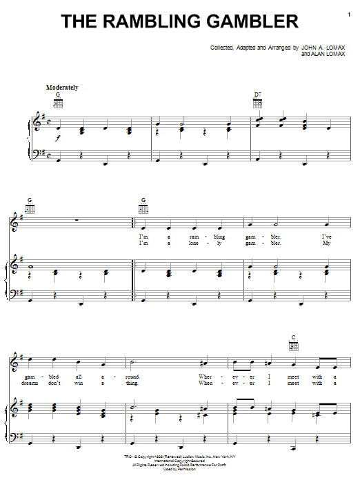 Download or print Alan Lomax The Rambling Gambler sheet music, chords and digital score arranged for Piano, Vocal & Guitar Chords (Right-Hand Melody). This Country score includes 2 page(s).