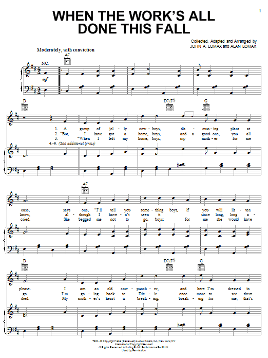 Download or print Alan Lomax When The Work's All Done This Fall sheet music, chords and digital score arranged for Piano, Vocal & Guitar Chords (Right-Hand Melody). This Country score includes 2 page(s).