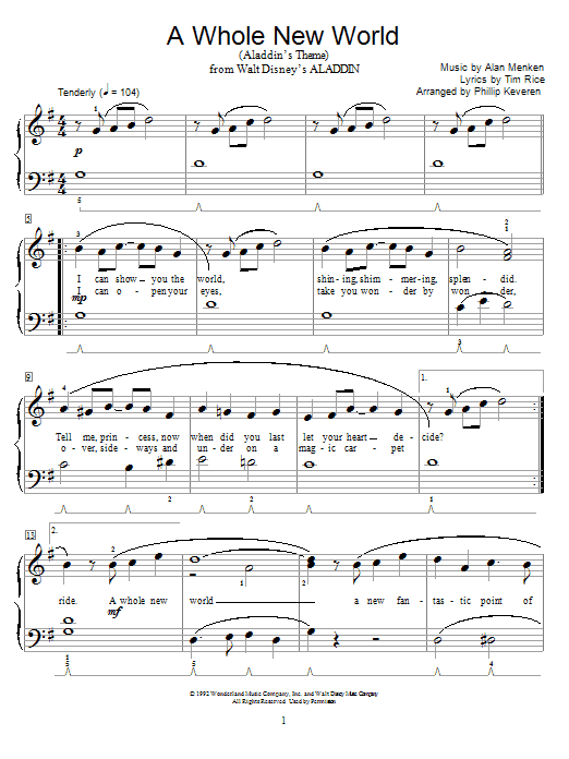 Download or print Alan Menken & Tim Rice A Whole New World (from Aladdin) (arr. Phillip Keveren) sheet music, chords and digital score arranged for Easy Piano. This Children score includes 4 page(s).
