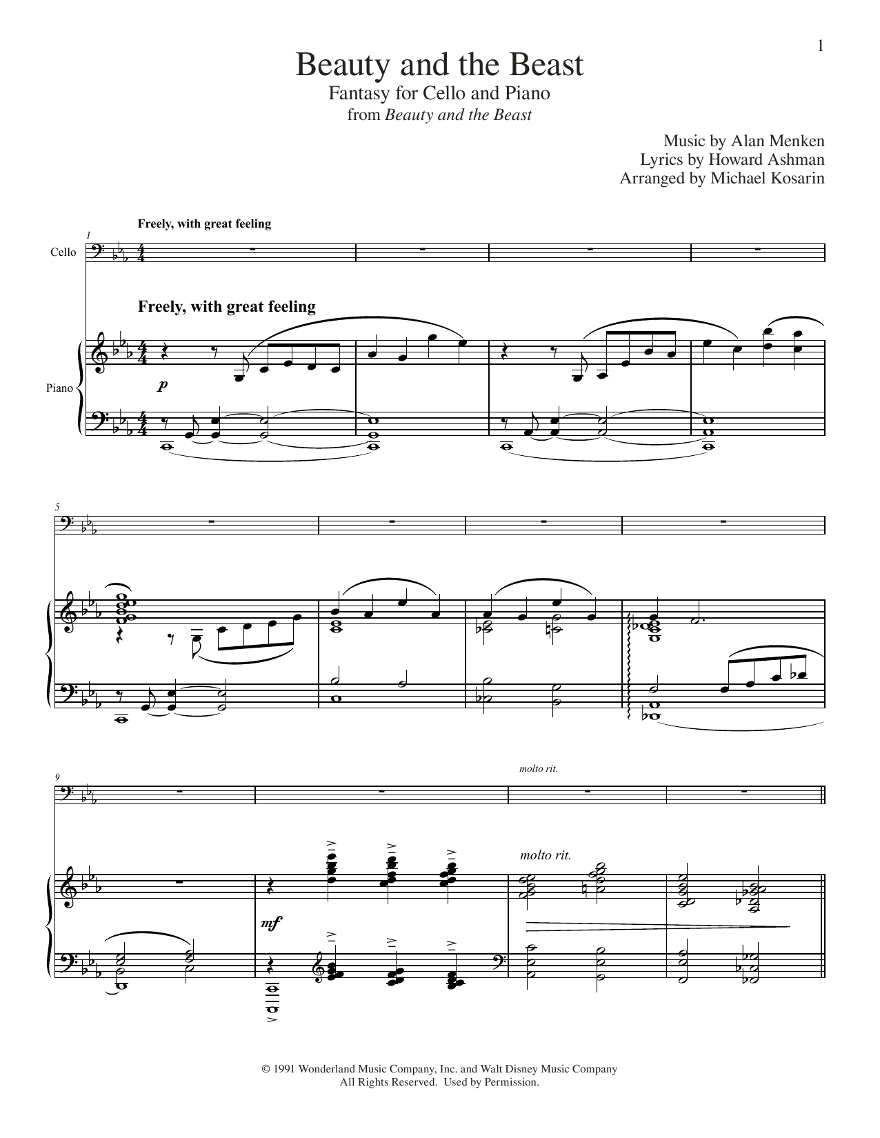 Download or print Alan Menken & Howard Ashman Beauty And The Beast (arr. Michael Kosarin) sheet music, chords and digital score arranged for Cello and Piano. This Disney score includes 8 page(s).
