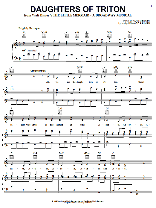 Download or print Alan Menken Daughters Of Triton (from The Little Mermaid: A Broadway Musical) sheet music, chords and digital score arranged for Piano, Vocal & Guitar Chords (Right-Hand Melody). This Children score includes 4 page(s).