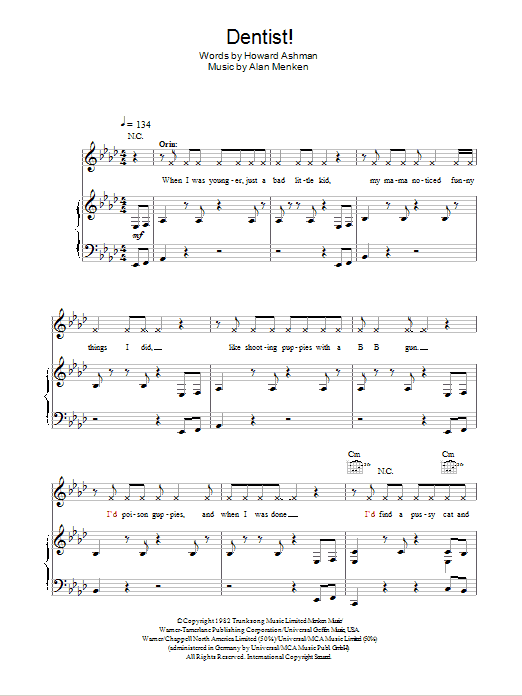 Download or print Howard Ashman Dentist! (from Little Shop of Horrors) sheet music, chords and digital score arranged for Piano, Vocal & Guitar Chords. This Film/TV score includes 6 page(s).