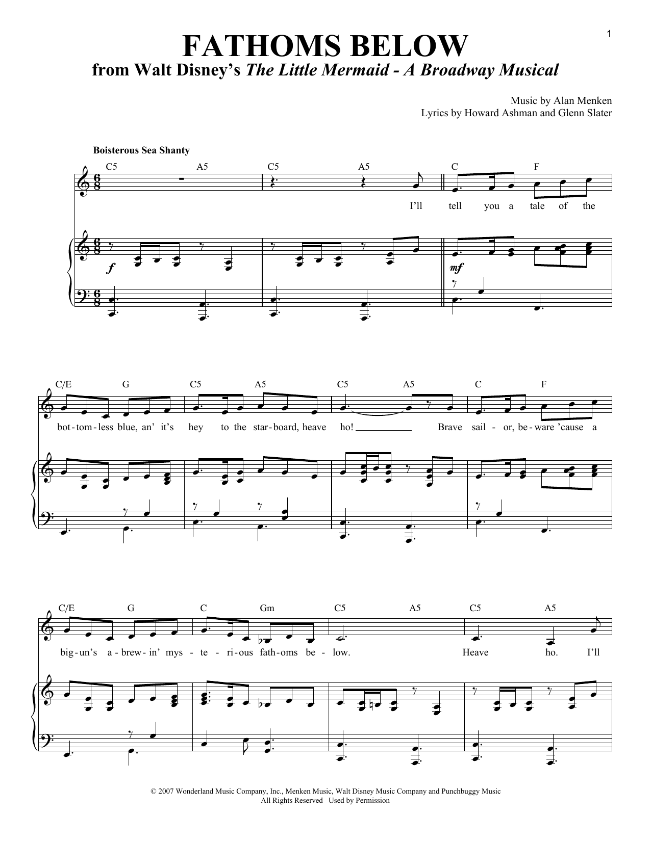 Download or print Alan Menken Fathoms Below sheet music, chords and digital score arranged for Piano & Vocal. This Broadway score includes 5 page(s).