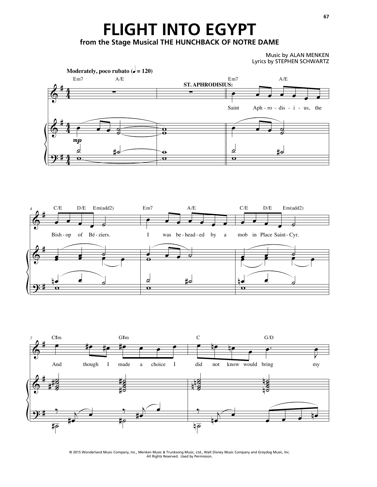 Download or print Alan Menken & Stephen Schwartz Flight Into Egypt (from The Hunchback Of Notre Dame: A New Musical) sheet music, chords and digital score arranged for Piano & Vocal. This Disney score includes 5 page(s).