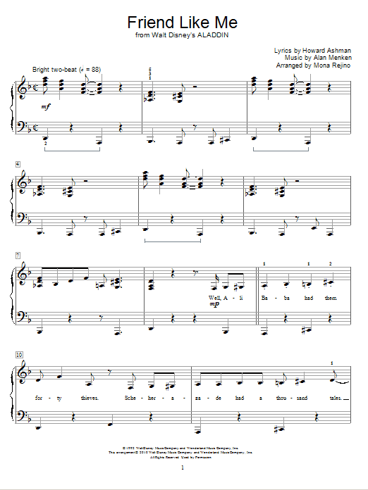 Download or print Alan Menken & Howard Ashman Friend Like Me (from Aladdin) (arr. Mona Rejino) sheet music, chords and digital score arranged for Educational Piano. This Children score includes 6 page(s).