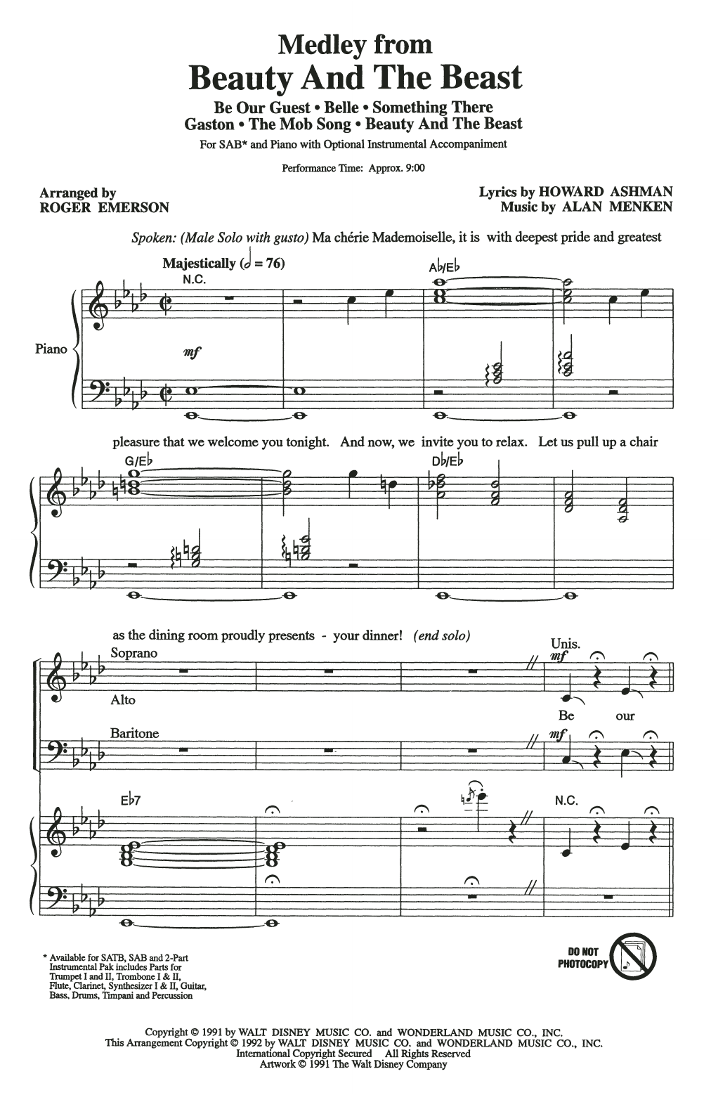 Download or print Alan Menken & Howard Ashman Beauty And The Beast (Medley) (arr. Roger Emerson) sheet music, chords and digital score arranged for SAB Choir. This Disney score includes 38 page(s).
