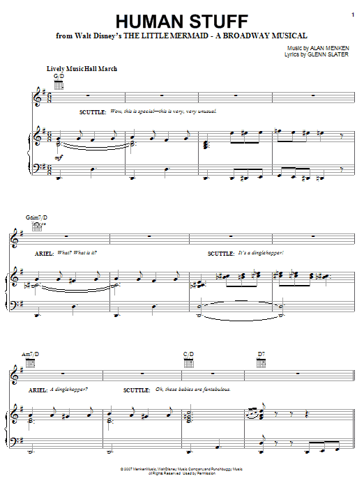 Download or print Alan Menken Human Stuff (from The Little Mermaid: A Broadway Musical) sheet music, chords and digital score arranged for Piano, Vocal & Guitar Chords (Right-Hand Melody). This Children score includes 7 page(s).