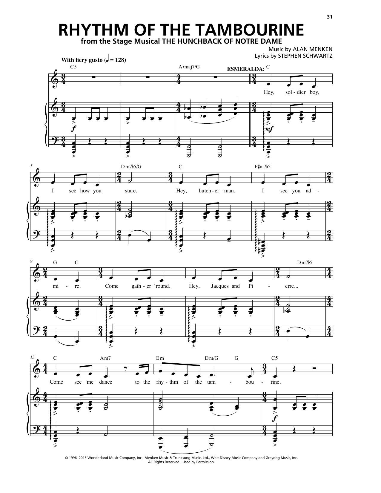 Download or print Alan Menken & Stephen Schwartz Rhythm Of The Tambourine (from The Hunchback Of Notre Dame: A New Musical) sheet music, chords and digital score arranged for Piano & Vocal. This Disney score includes 4 page(s).