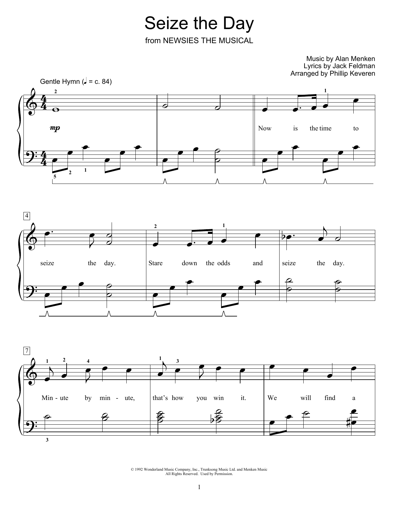 Download or print Alan Menken & Jack Feldman Seize The Day (from Newsies The Musical) (arr. Phillip Keveren) sheet music, chords and digital score arranged for Educational Piano. This Disney score includes 4 page(s).
