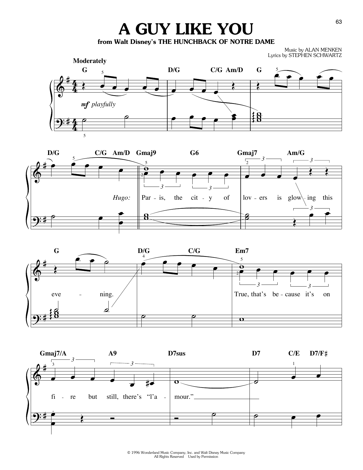 Download or print Alan Menken & Stephen Schwartz A Guy Like You (from The Hunchback of Notre Dame) sheet music, chords and digital score arranged for Easy Piano. This Disney score includes 7 page(s).