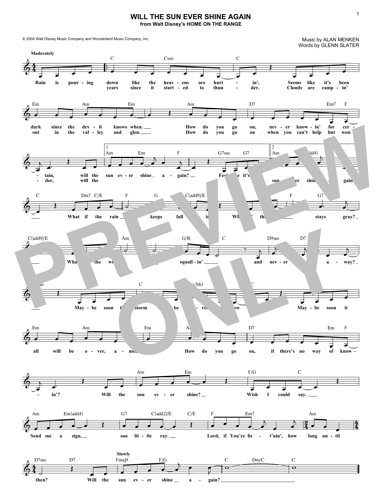 Download or print Alan Menken Will The Sun Ever Shine Again sheet music, chords and digital score arranged for Lead Sheet / Fake Book. This Children score includes 1 page(s).