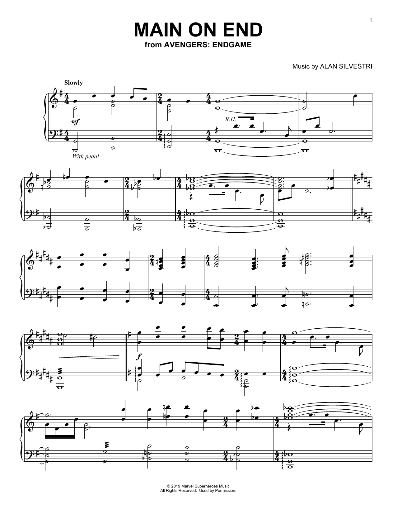 Download or print Alan Silvestri Main on End (from Avengers: Endgame) sheet music, chords and digital score arranged for Piano Solo. This Film/TV score includes 3 page(s).
