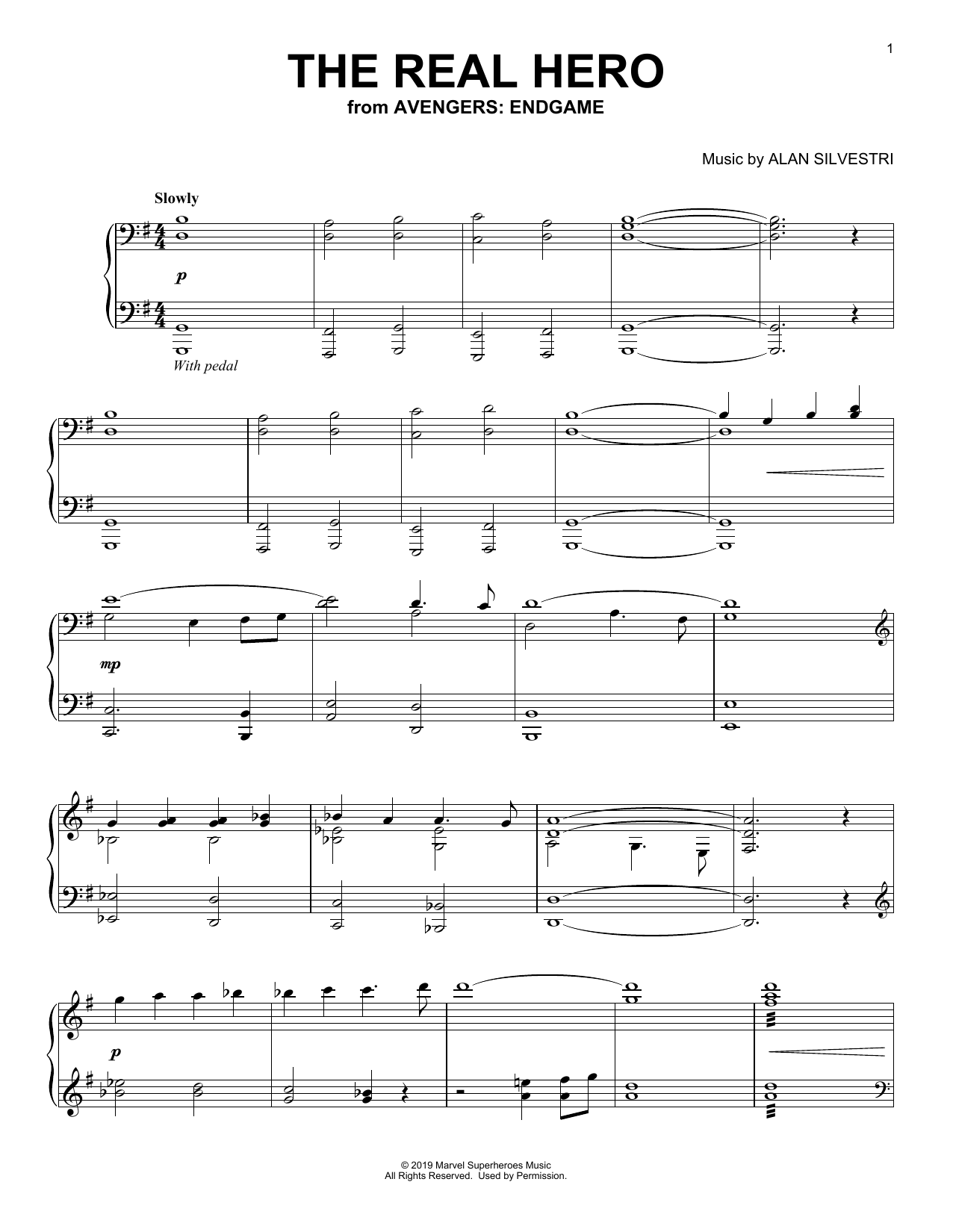 Download or print Alan Silvestri The Real Hero (from Avengers: Endgame) sheet music, chords and digital score arranged for Piano Solo. This Film/TV score includes 4 page(s).