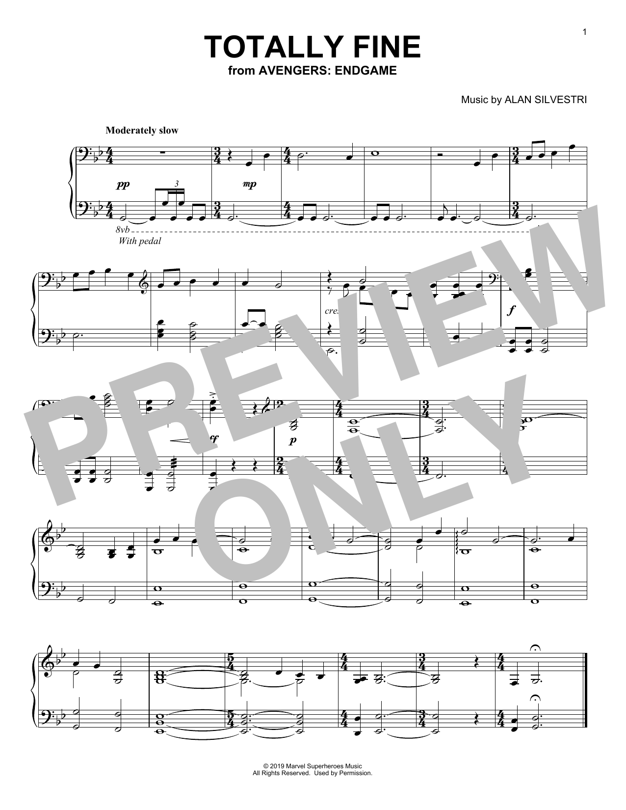 Download or print Alan Silvestri Totally Fine (from Avengers: Endgame) sheet music, chords and digital score arranged for Piano Solo. This Film/TV score includes 1 page(s).