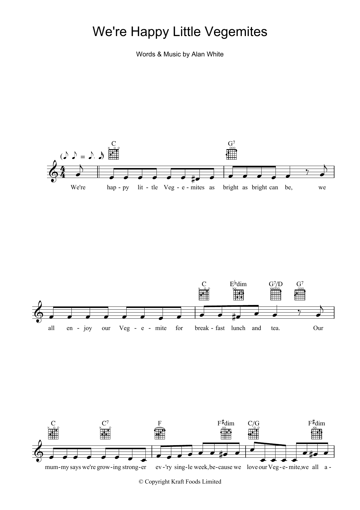 Download or print Alan White We're Happy Little Vegemites sheet music, chords and digital score arranged for Lead Sheet / Fake Book. This Film/TV score includes 2 page(s).