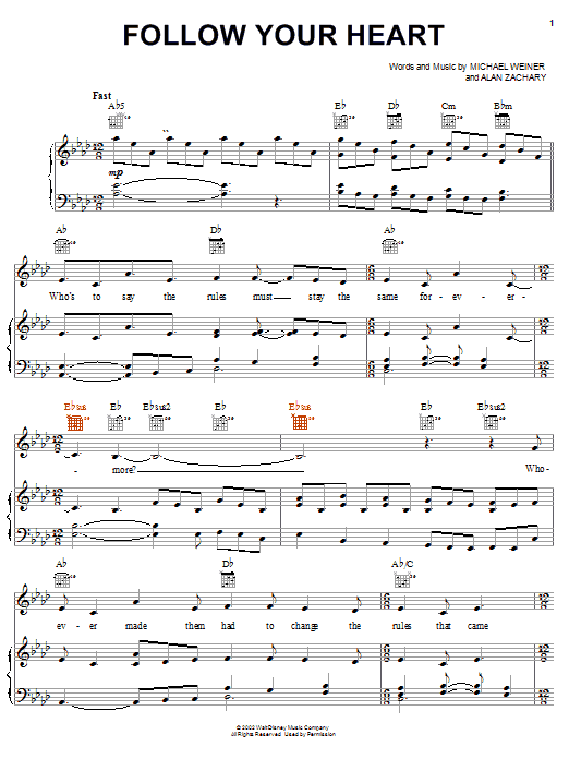 Download or print Michael Weiner Follow Your Heart sheet music, chords and digital score arranged for Piano, Vocal & Guitar Chords (Right-Hand Melody). This Disney score includes 8 page(s).