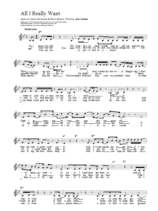 Download or print Alanis Morissette All I Really Want sheet music, chords and digital score arranged for Piano, Vocal & Guitar Chords (Right-Hand Melody). This Pop score includes 6 page(s).