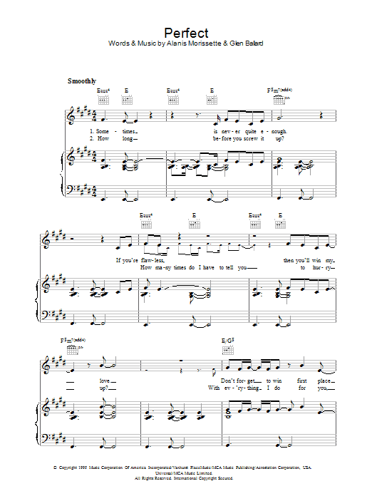 Download or print Alanis Morissette Perfect sheet music, chords and digital score arranged for Piano, Vocal & Guitar Chords (Right-Hand Melody). This Pop score includes 5 page(s).