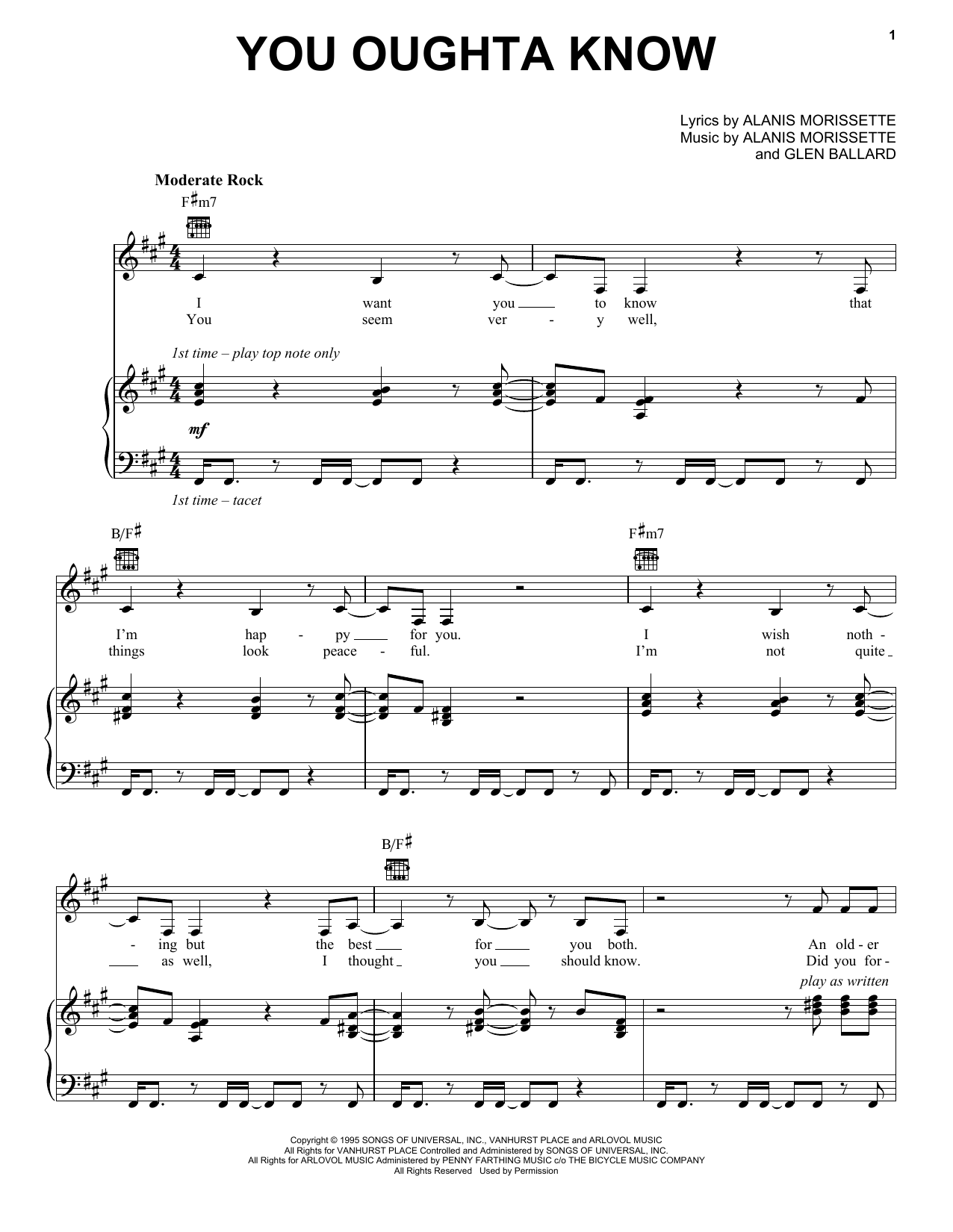 Download or print Alanis Morissette You Oughta Know sheet music, chords and digital score arranged for Piano, Vocal & Guitar Chords (Right-Hand Melody). This Pop score includes 5 page(s).