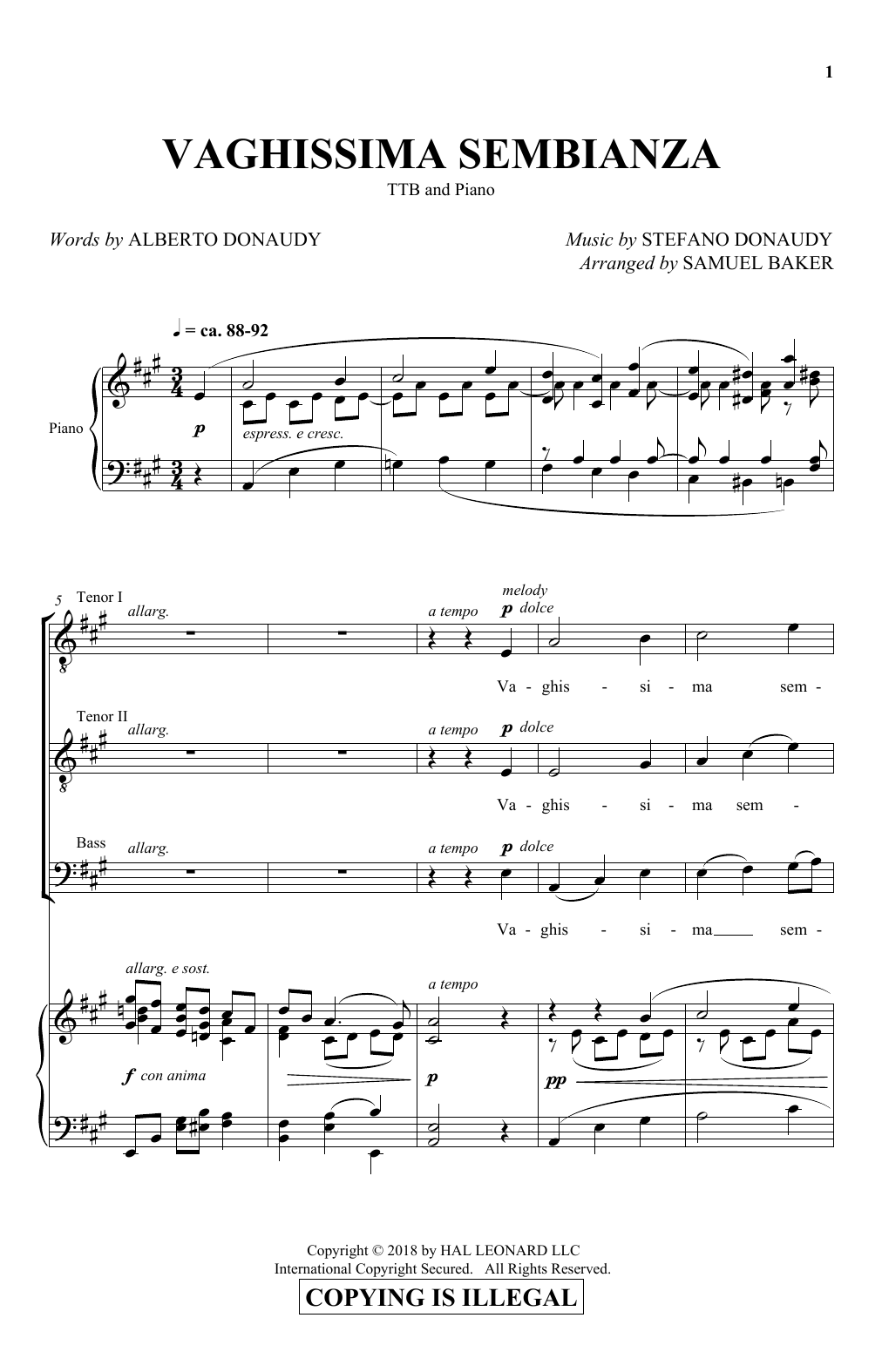 Download or print Albert Donaudy & Stefano Donaudy Vaghissima Sembianza (arr. Samuel Baker) sheet music, chords and digital score arranged for TTBB Choir. This Concert score includes 8 page(s).
