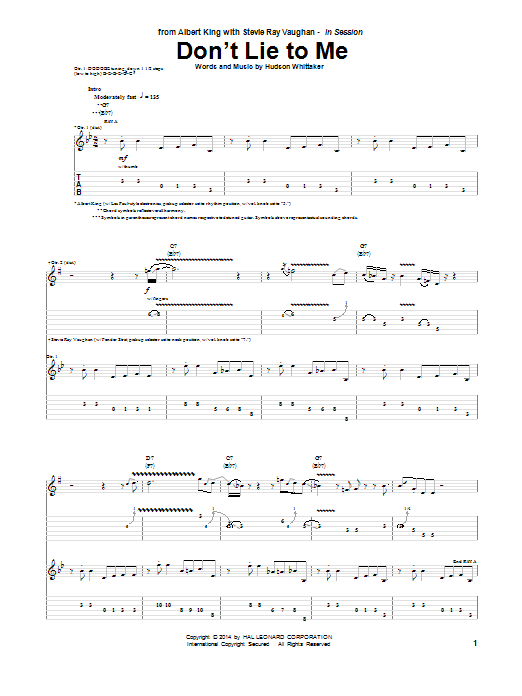 Download or print Albert King & Stevie Ray Vaughan Don't Lie To Me sheet music, chords and digital score arranged for Guitar Tab. This Pop score includes 31 page(s).