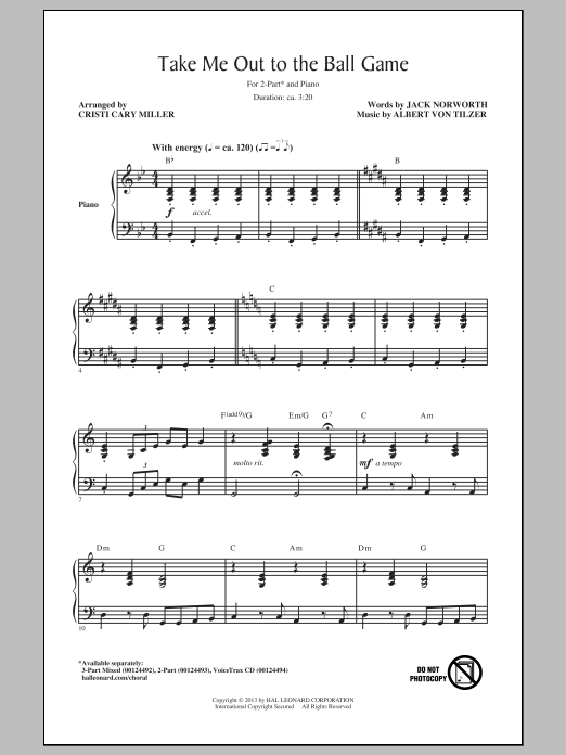 Download or print Cristi Cary Miller Take Me Out To The Ball Game sheet music, chords and digital score arranged for 3-Part Mixed Choir. This Standards score includes 11 page(s).