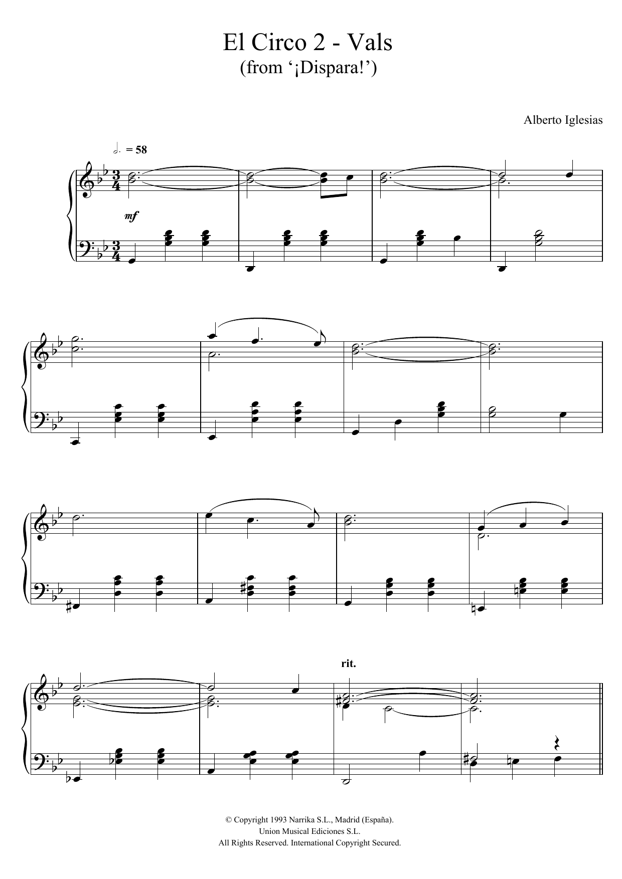 Download or print Alberto Iglesias El Circo 2 - Vals (from "Dispara!") sheet music, chords and digital score arranged for Piano Solo. This Film/TV score includes 5 page(s).