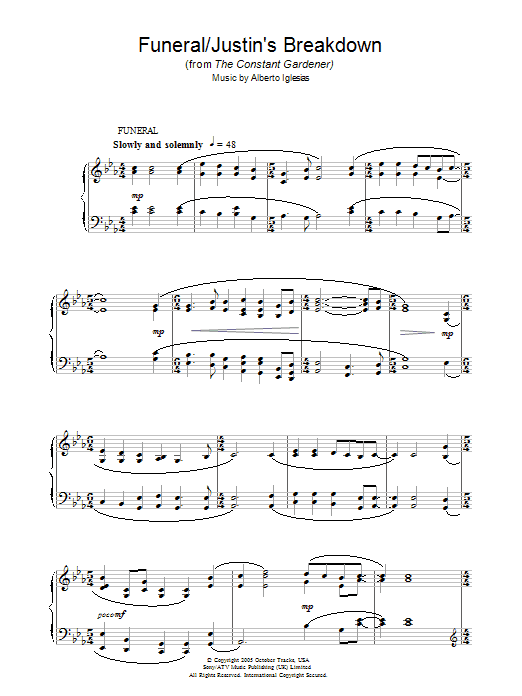 Download or print Alberto Iglesias Funeral/Justin's Breakdown (from The Constant Gardener) sheet music, chords and digital score arranged for Piano Solo. This Film/TV score includes 3 page(s).
