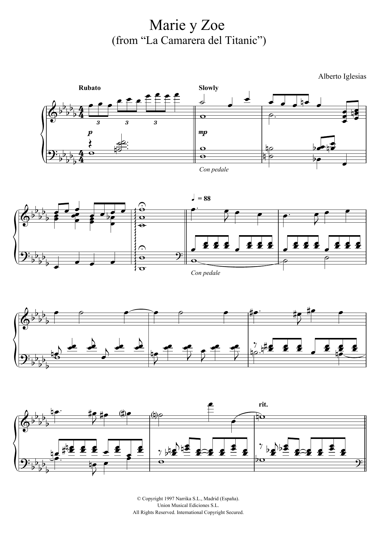 Download or print Alberto Iglesias Marie y Zoe (from "La Camarera del Titanic") sheet music, chords and digital score arranged for Piano Solo. This Film/TV score includes 3 page(s).