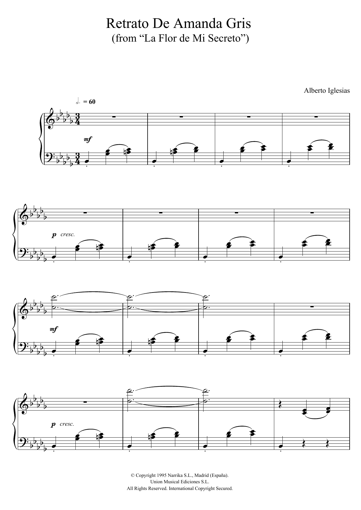 Download or print Alberto Iglesias Retrato De Amanda Gris (from "La Flor de Mi Secreto") sheet music, chords and digital score arranged for Piano Solo. This Film/TV score includes 3 page(s).